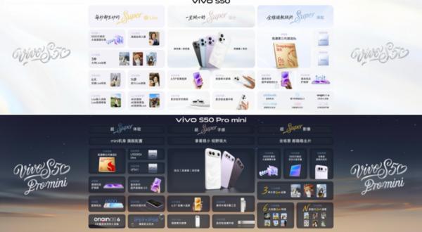 近日,vivo 正式发布全新 vivo S50系列,包括 vivo S50 与 vivo S50 Pro mini 两款新品。作为 S 系列美学旗舰的焕新之作,S50系列在设计、影像、性能与体验等方面全面升级:vivo S50 以“满配实力”重塑同档标准版认知,vivo S50 Pro mini 则在小巧机身中融入更旗舰配置,为偏爱小屏的用户提供全能新选择。