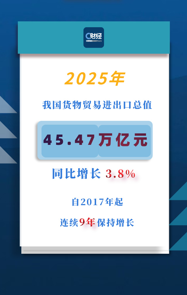 国新办14日举行新闻发布会,介绍2025年全年进出口情况。会上,海关总署发布的数据显示,2025年,我国货物贸易进出口总值45.47万亿元,同比增长3.8%,自2017年起连续9年保持增长。其中,出口顶住逆风逆流,规模达到26.99万亿元,同比增长6.1%;进口18.48万亿元,规模创历史新高,同比增长0.5%,将连续17年成为全球第二大进口市场。